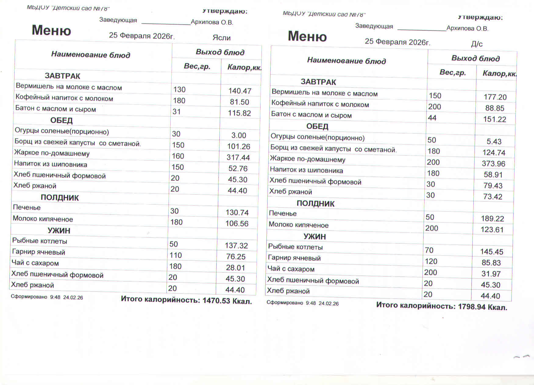 МБДОУ обеспечивает воспитанников сбалансированным 4-разовым питанием необходимым для нормального роста и развития. Режим питания: завтрак, обед, полдник, ужин (в соответствии с режимом возрастной группы). Блюда в соответствии с технологическими картами готовятся на пищеблоке МБДОУ.